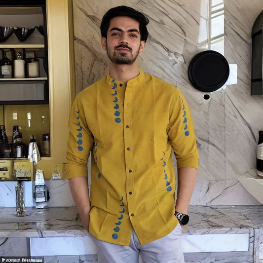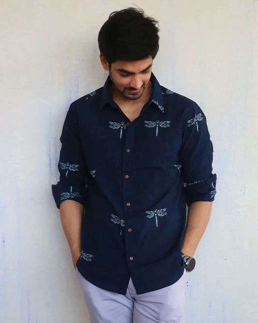 NAVY BLUE DRAGONFLY BLOCK-PRINTED MEN'S SHIRT