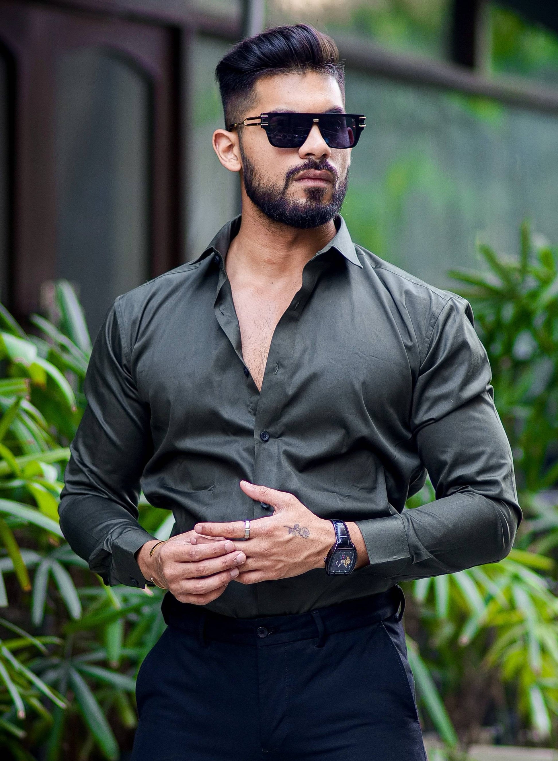 FORMY OLIVE GREEN LUXURY FORMAL SATIN COTTON SHIRT FOR MEN'S