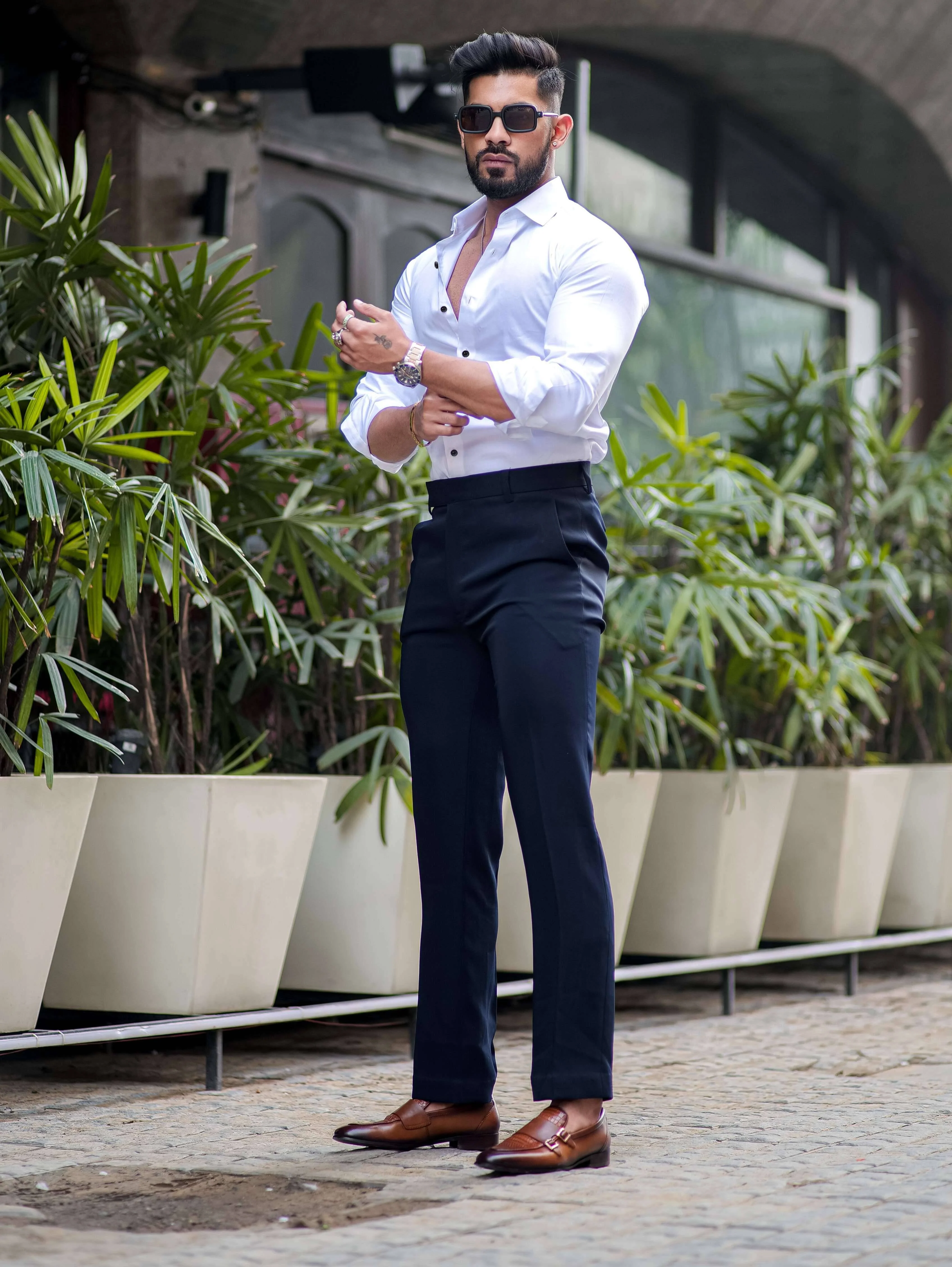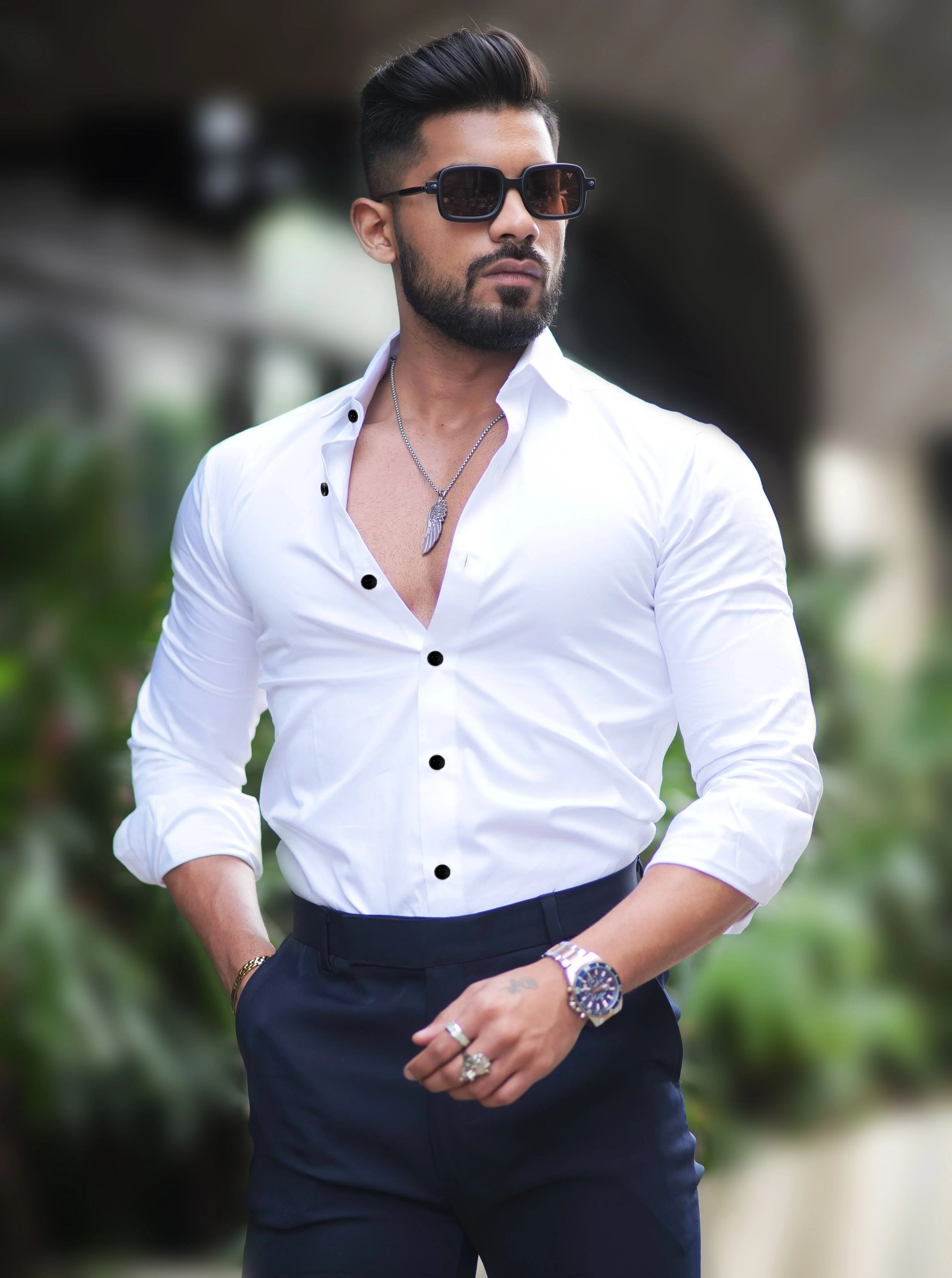 Story : go for this mens full white with black button satin cotton shirt Solid Design that takes you from boardroom to ballroom without any hassle. Featuring a spread collar, and full sleeves this go for party and casual.